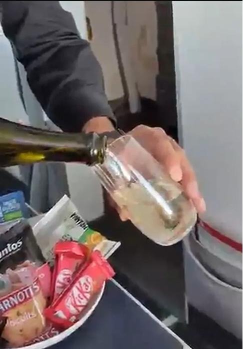 Han säger att det var en ”vild” upplevelse och flygvärdinnan gav honom vad han ville, samtidigt som han filmar att han får gratis prosecco och en enorm skål med snacks.