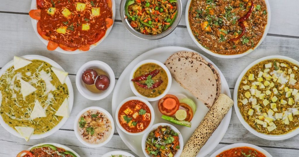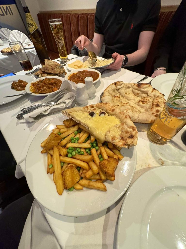 Bilden visar en tallrik full med kycklingnuggets, pommes frites och ärtor, med vad som liknar ett ostfyllt naanbröd på ena sidan och en öl på den andra. Det var en tydlig avvikelse från de traditionella curryrätterna, som vanligtvis serveras med fluffigt ris och krispiga poppadoms, som hans vänner njöt av.
