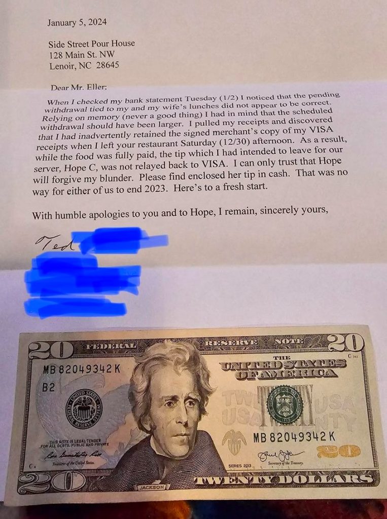 För att rätta till misstaget och säkerställa att Hope fick sitt välförtjänta tips, skickade Ted ett brev till restaurangen tillsammans med en note på 20 dollar.