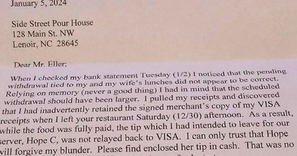 En kund vid namn Ted gjorde något ganska ovanligt för att säkerställa att hans server, Hope, fick det tips han tänkt till henne efter ett besök på Side Street Pour House and Grill i North Carolina, skriver The Good News Network.