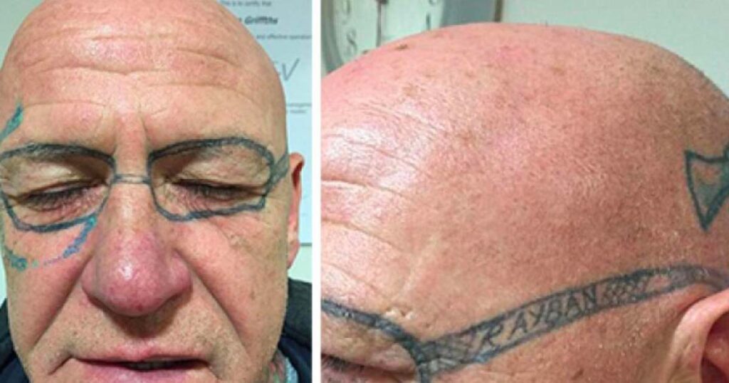 Han hade ett par Ray Ban-solglasögon tatuerade runt ögonen, skriver Daily Mail.