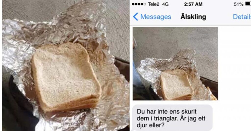 Hennes man skickade en bild på hennes lunch till henne och skämtade: ”Har du inte ens klippt upp dem? Vadå, är jag ett djur nu? ”