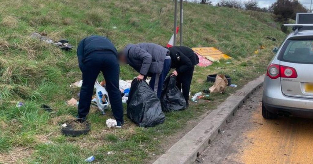 Tre män togs på bar gärning när de dumpade skräp längs motorvägen. Straffet? De fick städa upp allt igen.