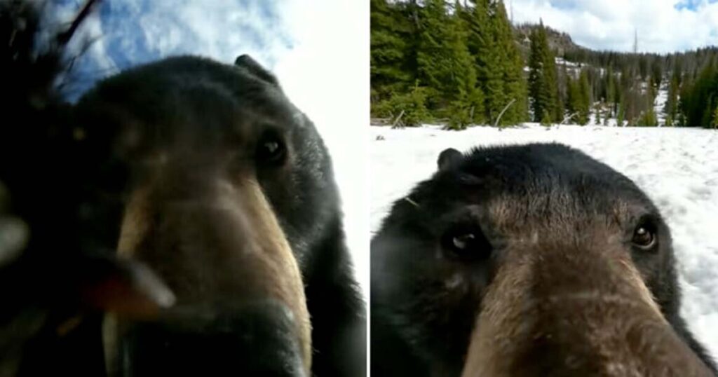 Den nyfikna björnen hade lyckats sätta på kameran och filmade sig själv, och det på nära håll!