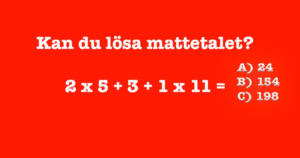 Därför bjuder vi er på ett litet matteproblem här som egentligen är tänkt att 11-åringar ska kunna lösa. Men de som har vart borta ett tag från skolan kan ju såklart ha glömt bort i vilken ordning man löser olika mattetal. Det viktigaste här är att du kan dina matte-regler och att följer dessa.