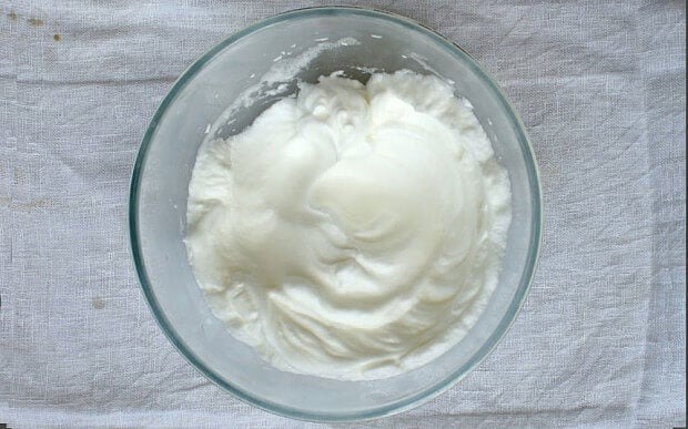 3. Ta ut äggvitan ur kylen och vispa den till hårda toppar. Du vet att det vita passar när du kan vända skålen upp och ner utan att något rinner ut.