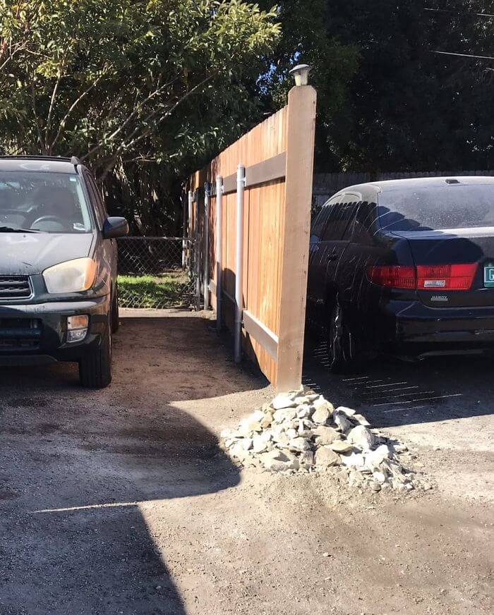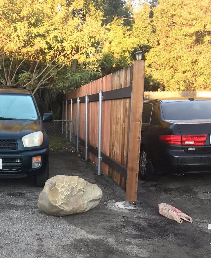 Grannen bestämde istället sig för att lösa diskussionen på ett minst sagt udda sätt. Förmodligen så gick spriten in och vettet ur. En morgon när Melissa vaknade så hade någon placerat en stor stenbumling framför hennes bil vilket resulterade i att hon inte kunde komma ut från sin parkeringsplats.