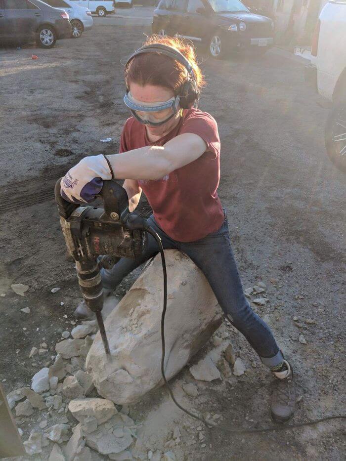 Vad grannen troligen inte visste var att Melissa hade utrustning som kunde hjälpa henne att avlägsna stenen. Så när Melissa var på väg till jobbet, runt 7-tiden på morgonen så greppade hon tag i en stor bilmaskin och började bila bort stenen.