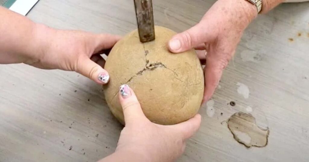 Du kan höra mormodern säga att hon släpade stenen runt i södra Alberta efter att hon hade hittat den. Hennes tålamod och flit lönade sig – det är en förstenad varelse inuti!