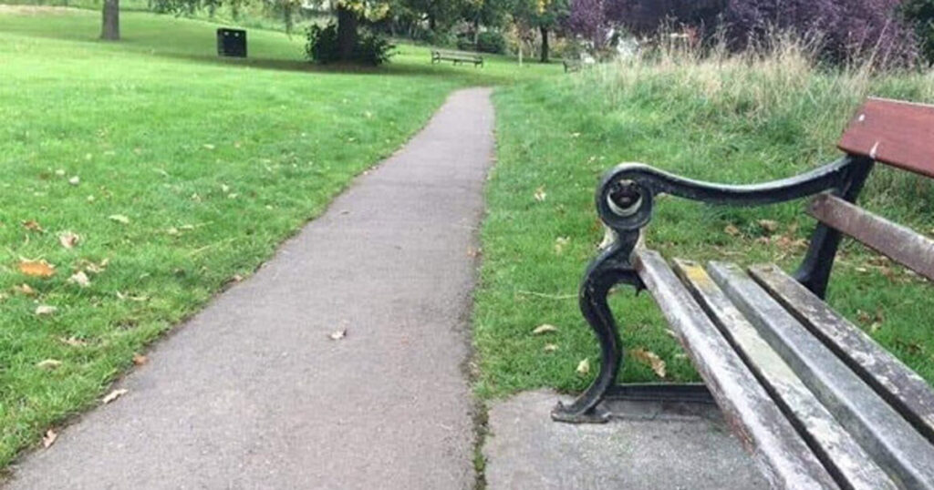 Bilden visar en park med gångväg, gräs, en träbänk och träd i bakgrunden. Någonstans på bilden gömmer sig en hund. Klarar du av att hitta den på 20 sekunder?
