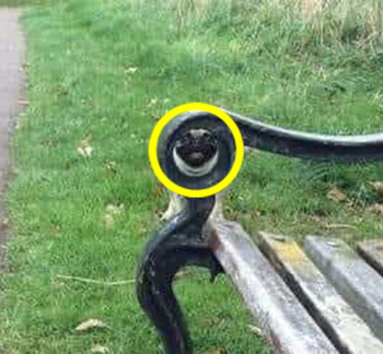 Sista ledtråden är att ”gömstället” har med bänken att göra. Ser du hunden nu?