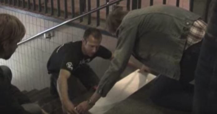 Det var sent på kvällen som aktionsgruppen tog tag och gick till jobbet. De slet av det översta lagret av trappan och ersatte det med elektroniska paneler som vid stress gav ut ljud – precis som ett piano!