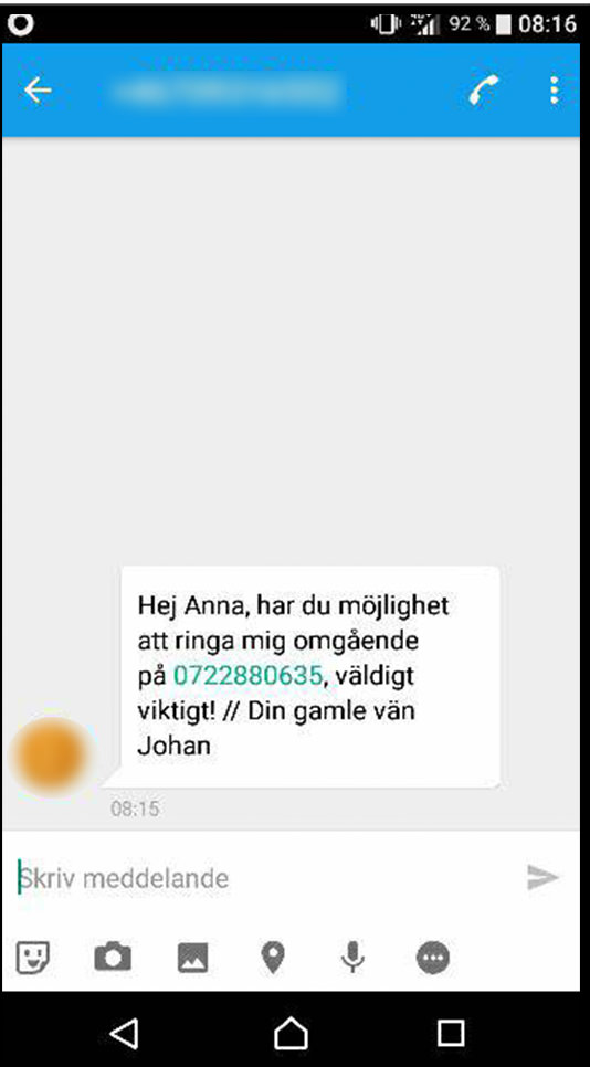 ”Hej Anna, har du möjlighet att ringa mig omgående på XXX, väldigt viktigt! // Din gamle vän Johan”