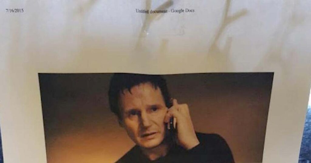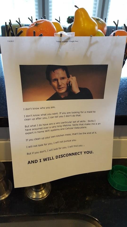 ”Jag vet inte vem du är. Jag vet inte vad du vill. Om du hoppas att hembiträdet ska städa efter dig kan jag säga att jag inte kommer att göra det. Men det jag har är en speciell förmåga Färdigheter jag har förvärvat under ett långt liv Färdigheter som gör mig till expert på WIFI-system och mobildataanvändning Om du städar i köket händer ingenting. Jag vill inte leta efter dig, jag vill inte jaga dig. om du inte gör det kommer jag att leta efter dig. Jag kommer att hitta dig. Och jag kommer att stänga av dig från nätet”, lyder meddelandet.