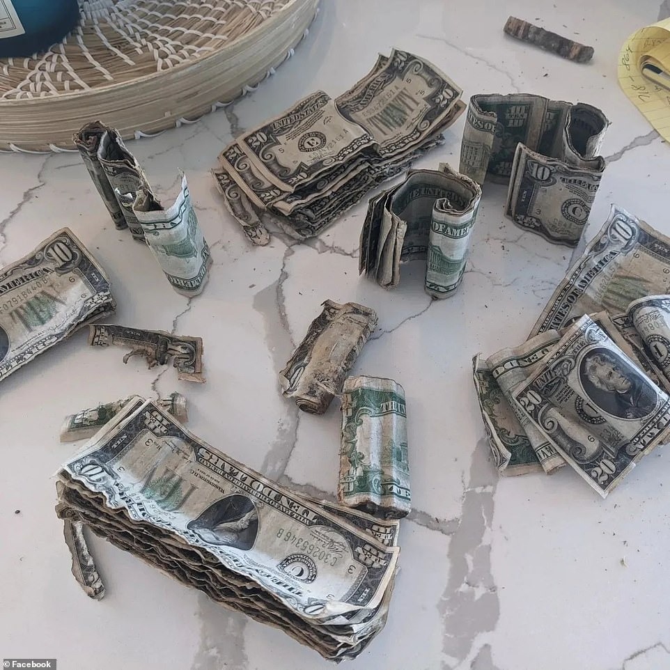 10 och 20 dollarsedlarna var prydligt ihoprullade och inslagna i brunt papper. Det ser ut som att pengarna har lagts i en burk under en av skifferplattorna i trädgården.