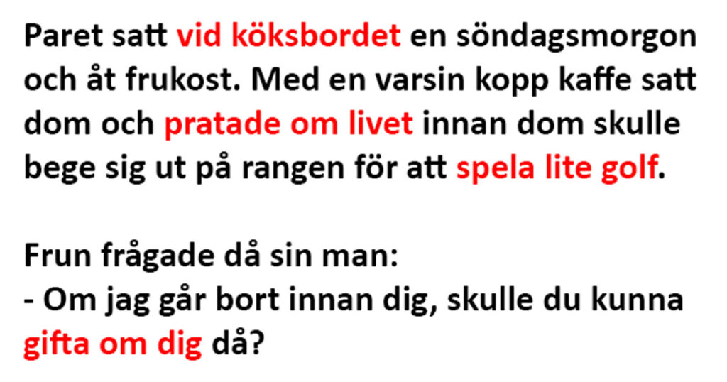 Paret satt vid köksbordet en söndagsmorgon och åt frukost. Med en varsin kopp kaffe satt dom och pratade om livet innan dom skulle bege sig ut på rangen för att spela lite golf.