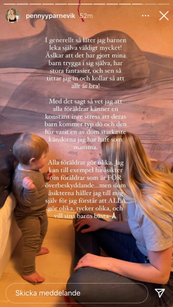 ”Oj vad den här bilden triggade massa mammor. Pebble mår bra och så klart kollade jag henne hela tiden. La upp bilden för att den var rolig och gullig. Sjukt att man måste säga det. Men det är ju en del av att dela med sig på sociala medier”, skriver hon.