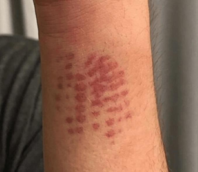 an tänkte inte så mycket på det först, men snart började en brännande känsla spridas upp i armen och ett stort rutnätsliknande utslag visade sig på hans handled.