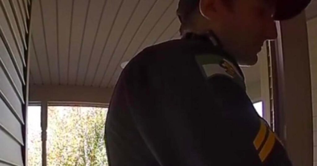 I videon kan man höra polismannen förklara att han levererar maten eftersom matbudet ”nyss blivit arresterad”.