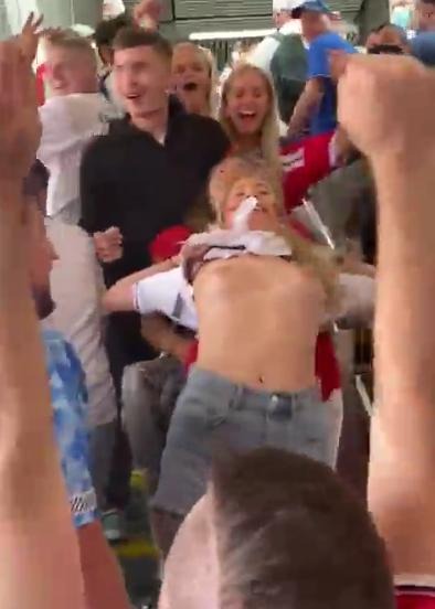I videon kan en kvinnlig brittisk fotbollsfan ses stå i en folkmassa och jubla kraftigt och uppenbarligen försöka övertala henne att visa sina bröst.