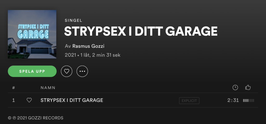 Rasmus Gozzi släppte i fredags låten ”STRYPSEX I DITT GARAGE” som nu toppar Spotify-listor. Låten är en svänga partydänga som ger nostalgikänslor av gammalt technosound och en lyrik av snuskigt innehåll.