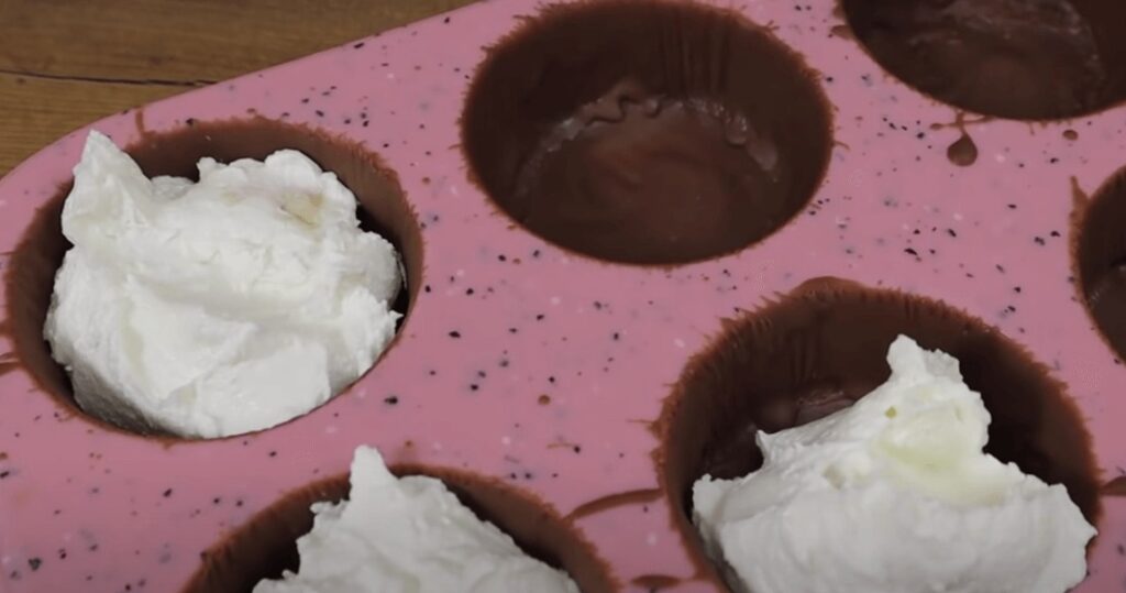 Ta ut muffinsformarna ur frysen och täck dem i ett tunt lager med chokladblandningen igen och ställ in dem i kylen. Lägg sedan en stor matsked av ostblandningen i varje form och bred ut dem fint så att de får en jämn yta.