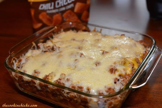 Lägg färsen ovanpå en ugnsfast form och bred gräddfil, tomater, majs, jalapeno, krossad nachos och avsluta med riven ost ovanpå.