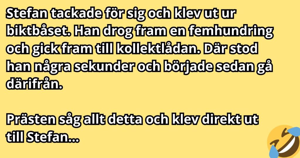 Stefan tackade för sig och klev ut ur biktbåset. Han drog fram en femhundring och gick fram till kollektlådan. Där stod han några sekunder och började sedan gå därifrån.