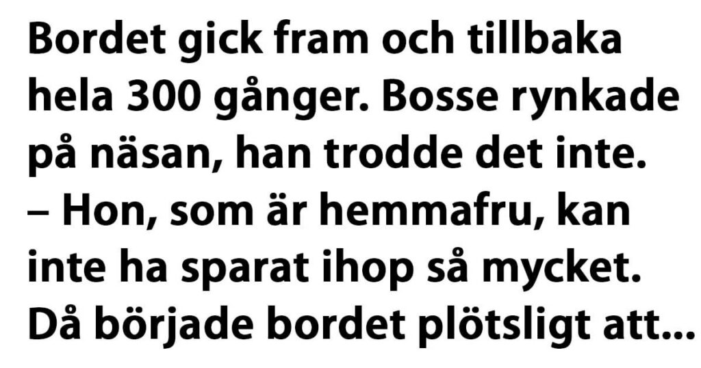 Bordet började då röra på sig. Det gick mellan butikens väggar 96 gånger, vilket ju faktiskt var exakt så många tusenlappar Bosse hade på sitt sparkonto.