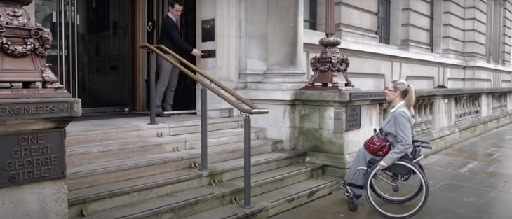 Att vara rullstolsburen kan ibland tillföra många problem, speciellt om det saknas ramper eller hissar. Vid en första anblick på bilden så ser det ut som att kvinnan aldrig ska kunna ta sig upp för trapporna med rullstolen – men vänta bara och se vad som händer!