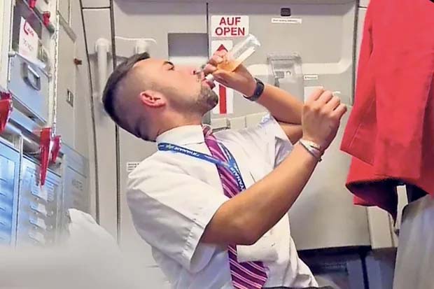 På bilder som överlämnats till polisen syns den uniformerade flygvärdinnan sitta nära utgången medan han tydligen försöker dricka rosé diskret.