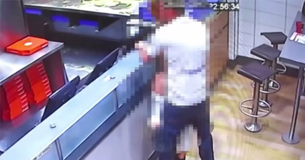 En övervakningskamera inne i fastigheten fångade parets vågade akt, som påbörjades efter att de beställt i kassan. Att deras aktivitet vore stötande för andra i lokalen verkar inte ha korsat deras tankar: