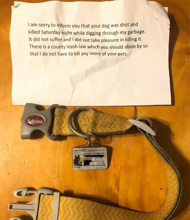 ”Jag är ledsen att meddela att din hund sköts och dödades på söndagskvällen när han grävde i mitt sopor. Den led inte, och jag njöt inte av att döda den”, står det i brevet, som fortsätter: