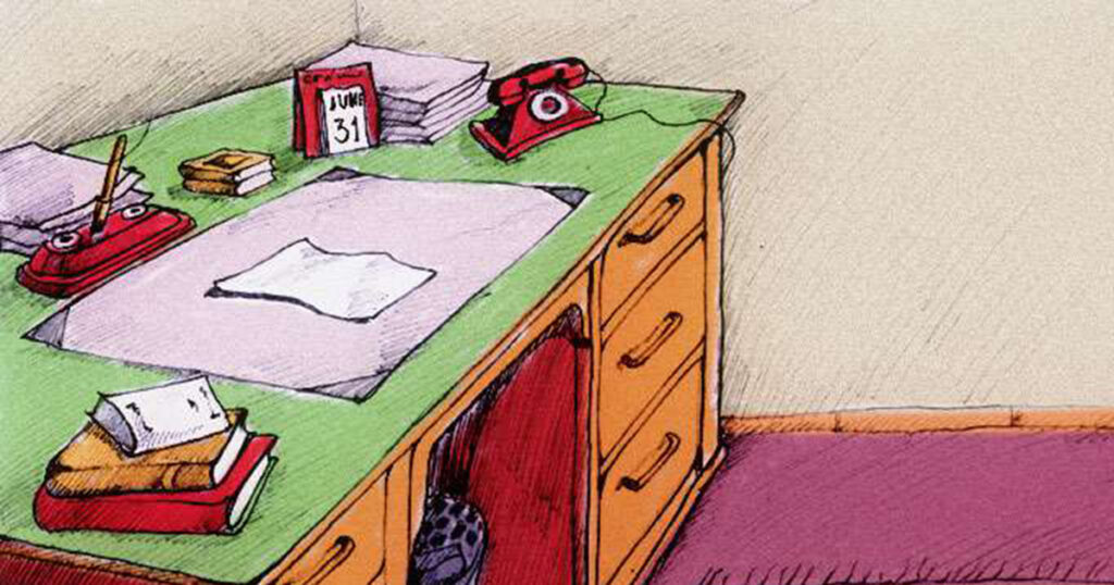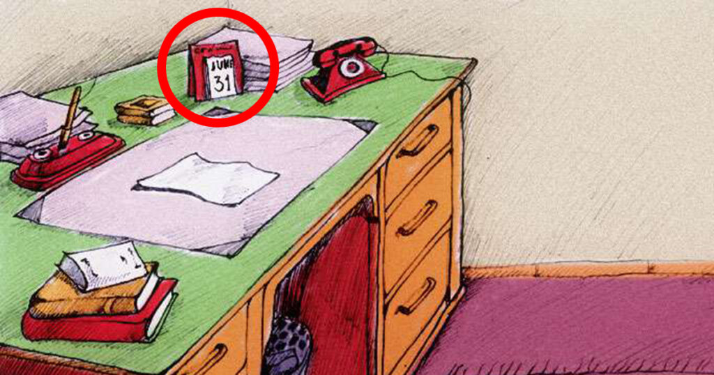 I den ritade bilden nedanför ser du ett helt vanligt rum med ett skrivbord, men något stämmer inte riktigt!