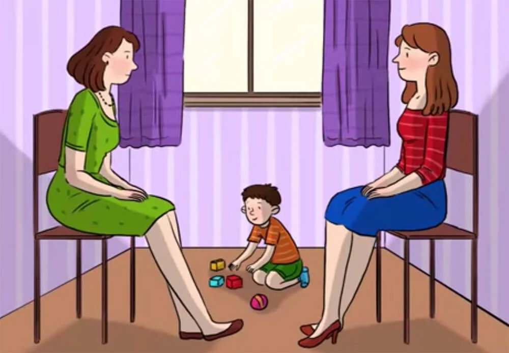 Genom att studera den här bilden av kvinnorna som sitter mitt emot varandra på separata stolar bör du kunna ta reda på vem som är mamma till pojken som leker på golvet.