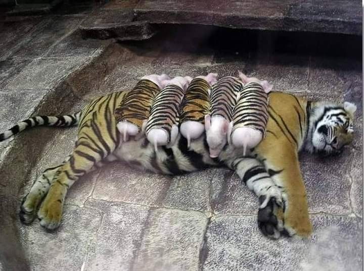 Eftersom tigern hade slutat att äta och sörjde sina ungar så valde djurparken – efter djurskötarens förslag – att klä ett par griskultingar i randiga kläder och skicka in till tigern. Inte som mat – utan som substitut för sina förlorade ungar.