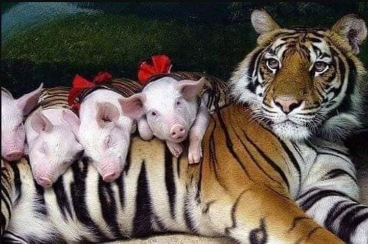 Tigermamman tog nämligen emot griskultingarna av ren lycka och gav dem kärlek. Än idag uppfostrar hon dem som om de vore hennes egna ungar och fenomenet har chockat djurfantaster världen över.