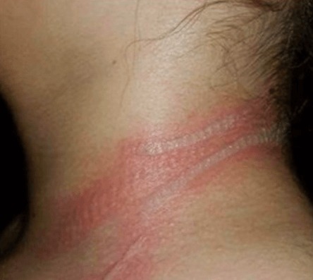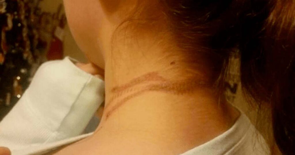 Gabbie fick stora märken runt halsen efter den här olyckan. Märkena ser inte särskilt trevliga ut, och är värda att varna för!