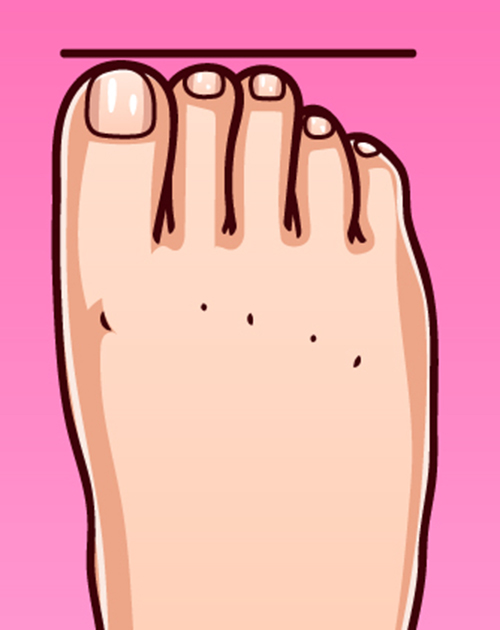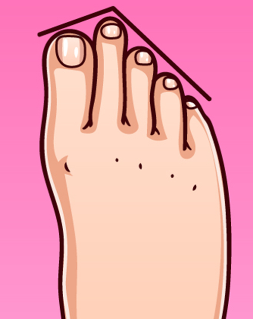 Den ”egyptiska foten” ser ut så här, där tårna blir kortare och kortare längs med foten. Personer som känner igen sig i den här bilden är fulla av självförtroende och uppskattar det goda i livet. Du vill helst leva ett liv i överflöd omgiven av sina nära och kära, och strävar alltid efter det bästa.