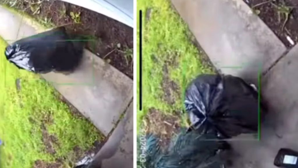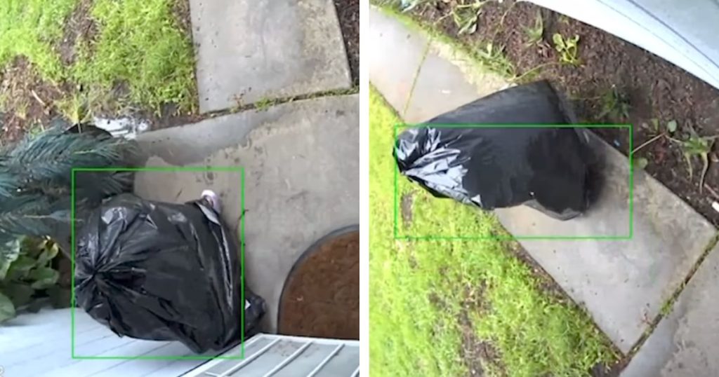 Där kunde han se hur en sopsäck smög sig in på hans uppfart och fortsatte ända fram till ytterdörren, där den svarta ”påsstjuven” lyckades stjäla ett paket.