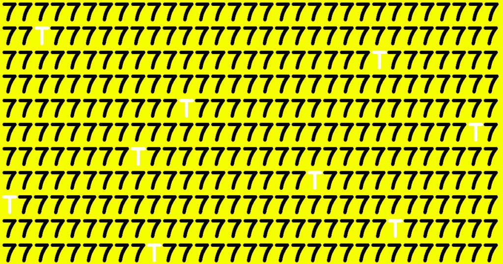 Så till dagens uppgift. Titta på bilden nedan – och se hur snabbt du hittar så många T som möjligt. Tid är avgörande här, eftersom de flesta människor kommer att kunna hitta alla T om du spenderar tillräckligt med tid.