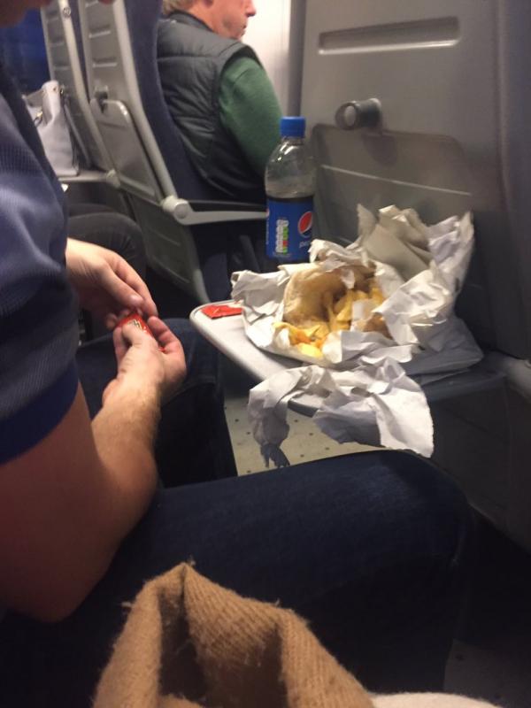 Den 22-åriga kvinnan antastades av den främmande passageraren som var i full gång med att proppa i sig pommes frittes och annan snabbmat, och som dessutom ville småprata under färden, skriver Metro.